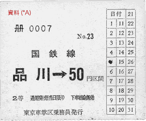 | 富士宮駅から品川まで運転されていた、創価学会団体臨時列車の乗客に対して、品川から先の区間用に発行したものです。辻坂昭浩著「国鐵乗車券類歴史事典」によれば1965年(昭和40年)1月7日から使用(*B)されたそうです。正式名称は不明です。ご存知の方は、お知らせ頂ければ幸いです。静岡鉄道管理局にも設備されていました。また、異様式の券については、池袋車掌区もご覧下さい。 |