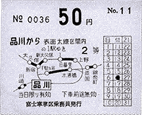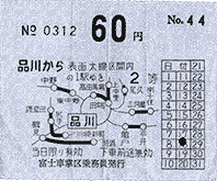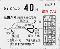 | 富士宮駅から品川まで運転されていた、創価学会団体臨時列車の乗客に対して、品川から先の区間用に発行したものですが、正式名称は不明です。図版は、各車掌区(沼津、富士、静岡)で共通(*B)だそうです。ご存知の方は、お知らせ頂ければ幸いです。東京車掌区にも設備されていました。 |